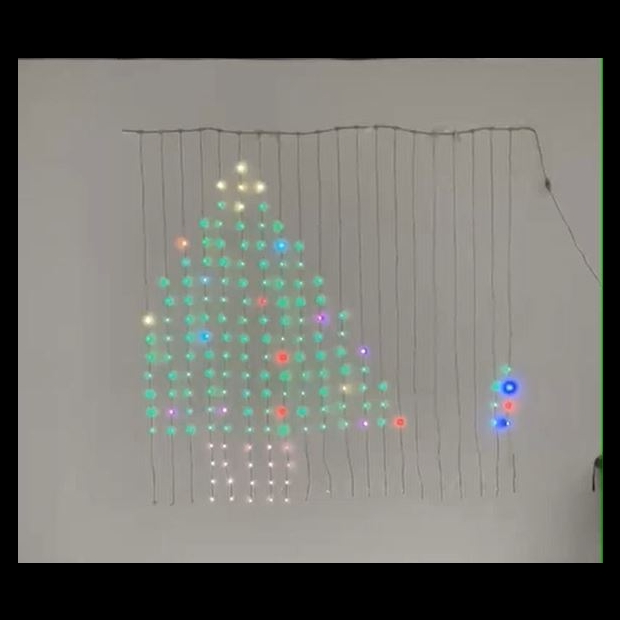 可以用手機設定手機塗鴉 傳送到白色控制器 可以調快慢流水效果 有音動功能 也可以配有背景 產品規格 品名 LED字幕流水窗簾燈 尺寸 3米x3米 400燈 顏色 RGB 功率 15W 電壓 220V/110V